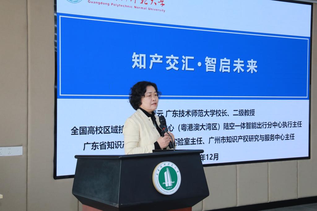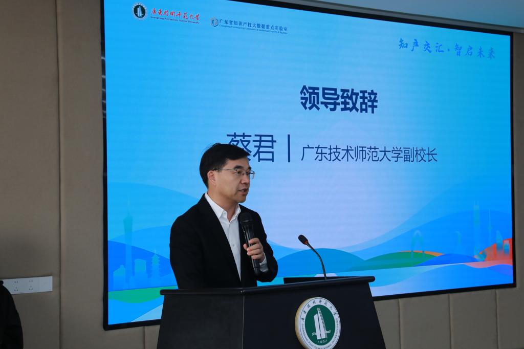 广东技术师范大学副校长蔡君在致辞中对与会嘉宾的到来表示欢迎,强调学校在推动知识产权与人工智能交叉融合、服务区域创新发展方面的责任与使命。