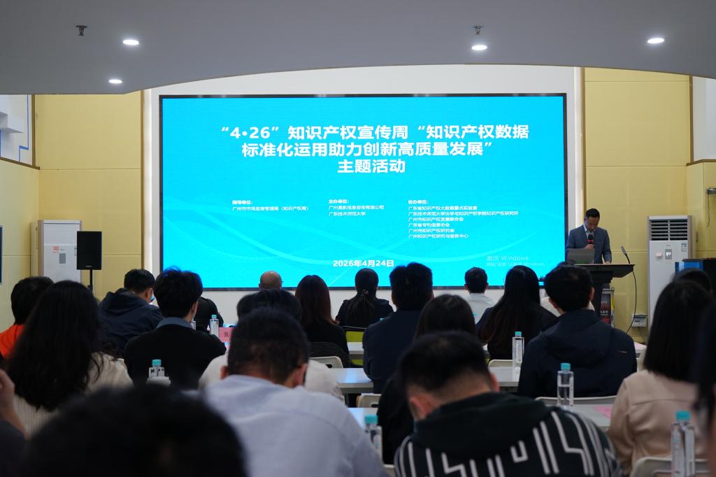 在第26个世界知识产权日来临之际,4月24日,由广州市市场监督管理局(知识产权局)指导,广州奥凯信息咨询有限公司、广东技术师范大学主办,广东省知识产权大数据重点实验室承办的“知识产权数据标准化运用助力创新高质量发展”主题活动在广东技术师范大学举办。来自政府部门、高校院所、龙头企业及知识产权服务机构的代表近70人参加活动。现场集中展示了广州市在知识产权数据加工标引、场景开发与赋能创新方面的最新实践成果,并为获评“广州市知识产权数据标准化运用典型案例”的单位颁发了典型案例证书。受实验室主任戴青云教授委托,实验室副主任雷方元教授、赖培源教授出席活动并作主题报告。
